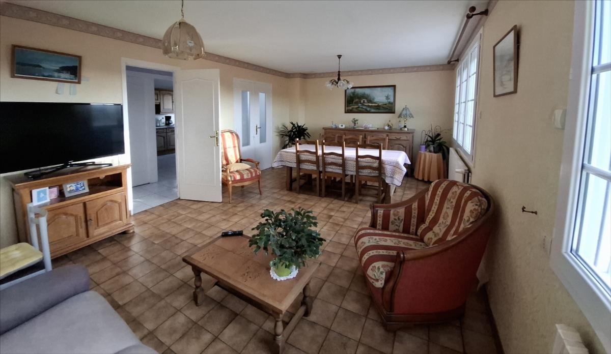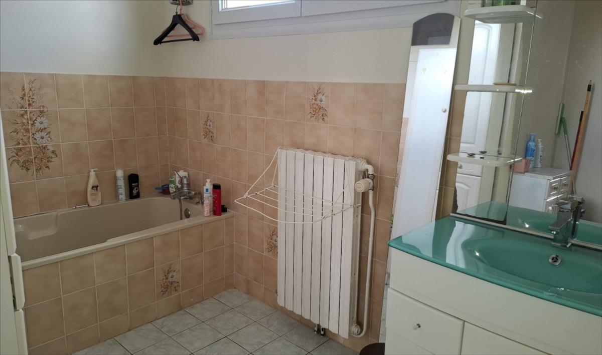 Pavillon sur sous-sol complet; en bon état.. Un pavillon sur sous-sol, couvert en tuile; comprenant :- sous-sol : entrée, arrière cuisine, chaufferie, garage avec porte motorisée.- au rez-de-chaussée : couloir, cuisine aménagée avec jolie vue dégagée, salon-séjour, trois chambres, salle de bains, WC.Grenier isolé au-dessus.Cour devant permettant le stationnement de plusieurs véhicules.  Jardin sur le côté. PAC aérothermie installée en 2019. Les informations sur les risques auxquels ce bien est exposé sont disponibles sur le site Géorisques : www. georisques. gouv. fr